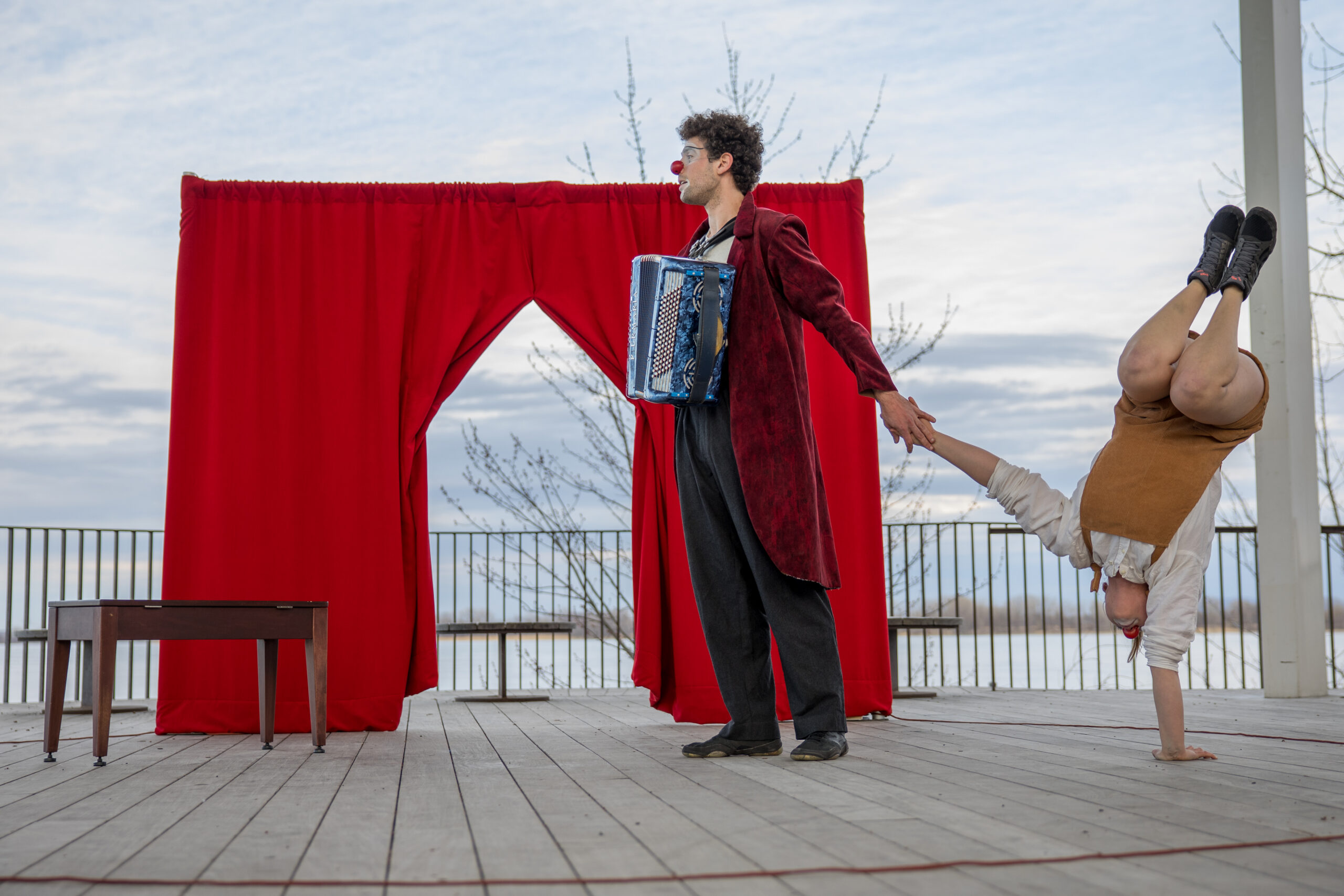 Une cheffe d’orchestre clownesque se prépare à faire résonner la musique, malgré un orchestre réduit à un seul musicien…Deux clowns naïfs, accompagnés de leur piano et instruments, évoluent acrobatiquement au rythme de mélodies originales, mêlant jonglerie et équilibre.