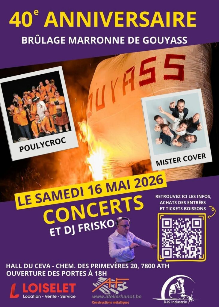 Le samedi 16 mai 2026 à partir de 18h, rendez-vous au Hall du CEVA à Ath pour une soirée légendaire pour fêter les 40 ans du brûlage marronne de Gouyass.