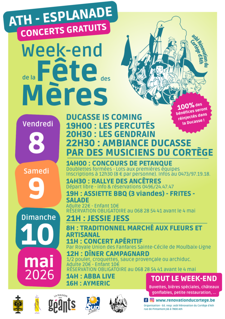 - Vendredi 8 mai : soirée d’ouverture Ducasse is coming avec en avant première Les Percutés, Les Gendrain pour finir la soirée avec une ambiance ducasse assurée par les musiciens du cortège.